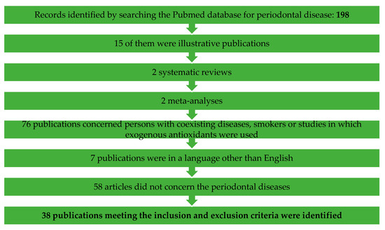 Concerning periodontal diseases: 198 were found, of which 38 publications meeting the inclusion and exclusion criteria were identified. One-hundred-and-sixty publications were excluded from this review—15 of them were illustrative publications, 2 systematic reviews, 2 meta-analyses, 76 publications concerned persons with coexisting diseases, smokers or studies in which exogenous antioxidants were used, 7 publications were in a language other than English and 58 articles did not concern periodontal diseases.