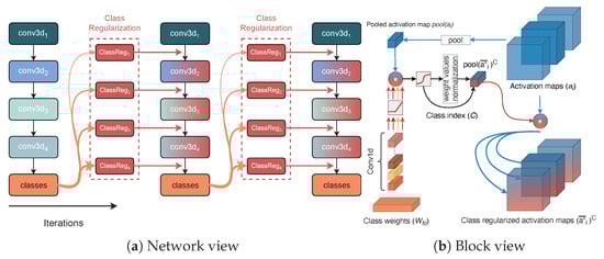 Class Regularization. An additional pathway between class weights and intermediate features is added (a) connecting different parts of the network across iterations. In Class Regularization blocks, activation maps are pooled to vector volumes (pool()) and multiplied by the class weights in order to select the resulting highest class activation (pool). A computational overview of the in-block operations (b) appears in Algorithm 1.