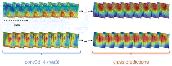 As Class Regularization is based on the injection of class-based information inside the feature-extraction process, a direct correlation between classes and features is made at each block in which the method is applied. Being able to represent the class features given a different feature space improves the overall explainability capabilities of the model. Through feature correlation, the method alleviates the curse of dimensionality problem of previous visualization methods that rely on back-propagating from the predictions to a particular layer []. Since the classes are represented in the same feature space as the activation maps of the block, we can discover regions in space and time that are informative over multiple network layers. To the best of our knowledge, this is the first method to visualize spatiotemporal class-specific features at each layer of the network.