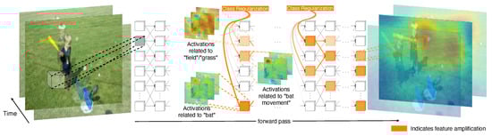 Visualization of feature amplification. As class-specific activations are reused by the network, informative spatiotemporal features for specific classes during an iteration are amplified. The effect of this amplification is propagated to deeper layers in the network through the connections of the layers in which Class Regularization is applied.