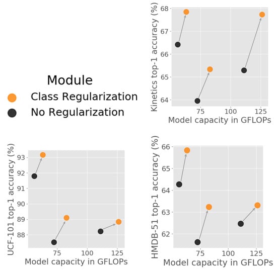 A comparison between results of models trained from scratch on Kinectics-400 appears in Table 2. Existing networks consider a complete change in the overall architecture or convolution operations in models, which is computationally challenging given the large memory requirements of spatiotemporal models. New models need to be trained for a significant number of iterations in order to achieve mild improvements, while additionally using large datasets [,] for pretraining. In contrast, the proposed Class Regularization method is used on top of existing architectures and only requires fine-tuning the dimensionality correspondence between the number of features in a specific layer and the features that are used for class predictions. Overall, the largest improvements were observed on networks with larger number of layers, such as ResNet101-3D, in comparison to networks with lower number of layers, with the best performing architectures being I3D and ResNet101-3D with Class Regularization with 67.8% top-1 accuracy and 67.7% top-1 accuracy, respectively.