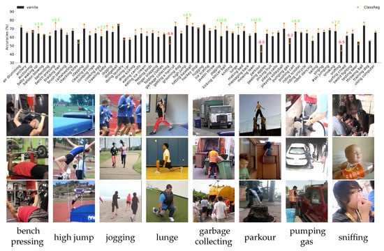 Per-class performance for ResNet-101 w/o Class Regularization with illustrative examples of classes with large performance gains or losses in Kinetics-400 [].