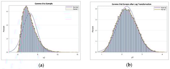 Simulated data from gamma distribution before and after log transformation. (a) The histogram of the sample before the application of log transformation with fitted normal and kernel curves; (b) The histogram of the sample after the application of log transformation with fitted normal and kernel curves.