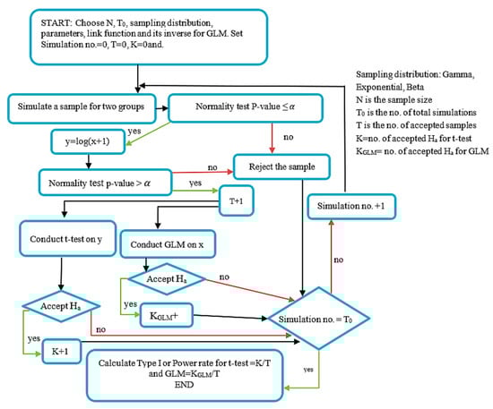 To assess the power rate, which is the probability of rejecting when is true and it is the complement of the Type II error rate, we assumed different mean values for the two groups by simulating the two groups from distributions with different parameters. In this case, since the variances are functions of the mean parameter as well, the unequal variance two-sample t-test was used. In these situations, if the p-value was less than the 5% significance level, then we rejected knowing that is true. If the p-value was larger than the significance level, we failed to reject and concluded that a Type II error was committed (because was true). Then, the power rate is the number of times was rejected (K for t-test and KGLM for GLM) divided by the total number of accepted simulated samples (K/T or KGLM/T). Each case (sample size, distribution, mean relationship) was repeated five million times (denoted as T0). The diagram of testing the Type I error algorithm is shown in Figure 2.