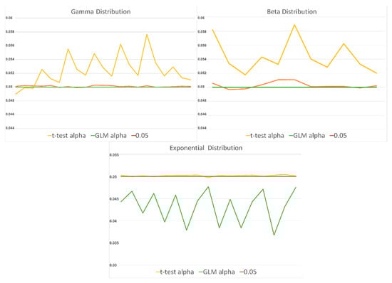 Summary of Type I error rates for gamma, exponential and beta distributed data tested using the t-test and GLM.