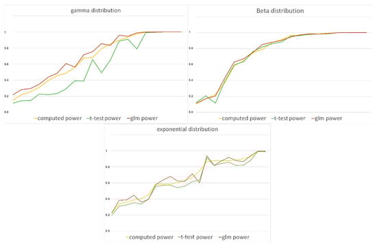 Table 4 contains summary information for the power results of gamma, exponential and beta distributed data tested using both methods. In about 86% of the exponentially distributed data examples, the power for the GLM was higher than that for the t-test, with absolute values of differences ranging from 0.001 to 0.108. Moreover, in 41% of the settings, GLM power rates exceeded or equalled the calculated power. Then again, in just 10% of the settings, t-test power rates exceeded the calculated power, while in the gamma-distributed data examples, the power for the GLM was higher in about 85% of the settings, with absolute values of differences ranging from 0.000 to 0.363. In addition, in 41% of the settings, GLM power rates exceeded or equalled the calculated power. Still, in just 15% of the settings, t-test power rates exceeded the calculated power. Figure 4 shows powers for both methods compared to the computed power rates for three distributions.