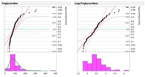 The normal Q–Q plots (up) for the Triglycerides variable before and after transformation and the frequency histogram of the Triglycerides variable on the left (down) is fitted with a gamma distribution (green).