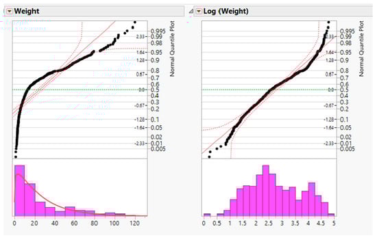 We have real data from a sample of 592 children who received multiple attempts to start peripheral IV catheters in the inpatient setting. The data were obtained from a study conducted at two southeastern US hospitals from October 2007 through October 2008 [21]. We are interested in checking the difference in children’s weight between children who lost IV vs. those who did not. The weight variable was skewed and fitted to a gamma distribution according to AICc values. The Q–Q plot and the histogram of the untransformed and log-transformed weight variable are given in Figure 6.