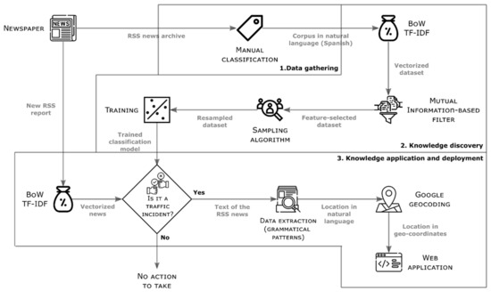 This project is split into three blocks to face the problem of informing citizens about traffic accidents detected automatically in the news reports provided by the RSS service of ‘El Diario de Juárez’ newspaper. These blocks are (a) data gathering, (b) knowledge discovery, and (c) knowledge application and deployment. Figure 2 presents a visual outline of our knowledge-based system, in which the input and output of each process are indicated under the arrows that represent how the data flow, submitting to transformations until becoming into knowledge.