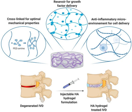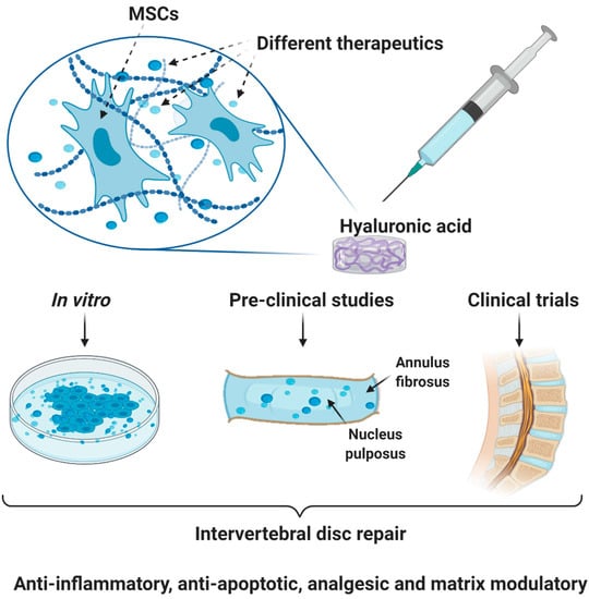 These treatments are not deemed curative, nor do they reverse the underlying pathology but rather aim to achieve symptomatic relief. Therefore, tissue-engineering approaches through developing biomaterial-based platforms to deliver active therapeutic products such as mesenchymal cells, inhibitory molecules and growth factors (GF) are being investigated to repair the degenerated IVD and revert it to a healthy state [34]. In the last few decades, hyaluronic acid (HA) was broadly used in treating osteoarthritis, popularised due to its anti-inflammatory, analgesic and extracellular matrix enhancing properties [35,36,37]. Hence, researchers shifted their interest towards treating the intervertebral disc using different HA compositions to deliver cells and therapeutics in vitro and in vivo (Figure 1 and Figure 2. Therefore, the objective of this review article is to summarise the different HA-based platforms used to date in treating IVD degeneration and LBP. We also summarised the biomarkers and signalling pathways involved in disc degeneration. Moreover, we recapitulate the most popular preclinical models utilized so far in the field of IVD degeneration, emphasizing the fundamental need for more representative models to replicate human pathophysiology.