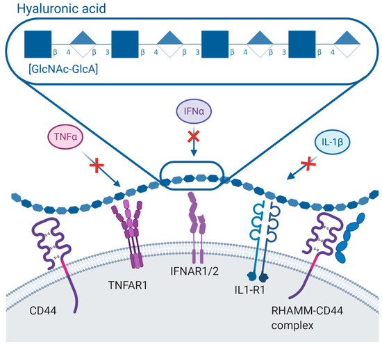 The anti-inflammatory role of hyaluronic acid (HA). HA molecule (on the top) is represented according to its international symbols by repeated units of glucuronic acid (GlcA-β1-3) and N-acetylglucosamine (GlcNAc-β1-4) disaccharides. The anti-inflammatory role of HA is mediated through reacting with its several receptors such as CD44 and receptor for HA-mediated motility (RHAMM) preventing the cascades signalled by inflammatory cytokines such as IFNα, TNFα and IL1β through deterring the contact with their receptors.
