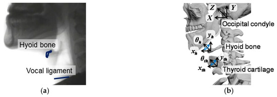 To analyze two-dimensional movements of the hyoid bone and thyroid cartilage, we used an X-ray video (DR-2000F, Hitachi Medical Co., Tokyo, Japan) obtained from a videofluoroscopic (VF) examination, which recorded normal swallowing with a healthy, 25-year-old male who was not diagnosed with any other eating disorder or neurological diseases. Here, the volunteer swallowed 5 mL of water, including the contrast of viscosity, once. The volunteer gave his consent before the VF examination. The experimental procedure was approved by the ethics committee of Japanese Red Cross Musashino Hospital (No. 705). In the analysis, as shown in Figure 1, we manually extracted the region of the hyoid bone and the vocal ligament as the part of thyroid cartilage, frame by frame. The displacement and posture of each skeletal element were measured in relation to the initial position and orientation. Then, the measured displacements and postures were transformed to a global coordinate system with the center at the left–right occipital condyles. Each skeletal element has a local coordinate system at its center of gravity, as shown in Figure 1, and the volume of the two elements was estimated from skeletal data of a CT scan (Revolution CT, GE Healthcare Japan Co., Tokyo, Japan) of the same male. In the study here, the cricoid cartilage was included as part of thyroid cartilage.