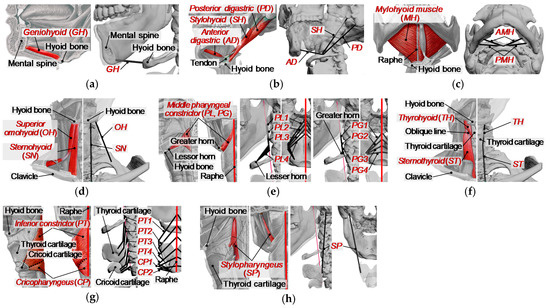 Swallowing-related muscles with wire models. Left image is an anatomical image of the muscle, and the wire model is shown on the right. (a) Geniohyoid (GH), (b) stylohyoid (SH) and digastric (AD, PD), (c) mylohyoid (AMH, PMH), (d) sternohyoid (SN) and omohyoid (OH), (e) middle pharyngeal constrictor (PG1-PG4, PL1-PL4), (f) thyrohyoid (TH) and sternothyroid (ST), (g) inferior pharyngeal constrictor (PT1-PT4) and cricopharyngeus (CP1, CP2), (h) stylopharyngeus (SP).