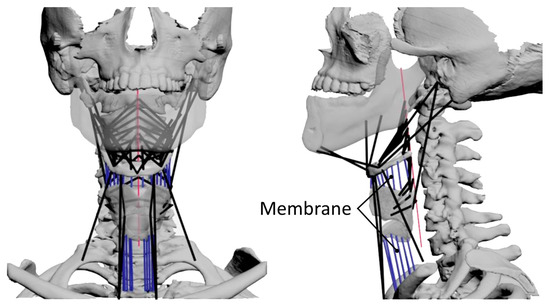 To analyze the muscle activity during swallowing, we developed a musculoskeletal model where a muscle is represented as an active constrictive wire actuator, by reference to the previous study [15]. In this model, the following 12 kinds of muscles were included as muscles acting on the hyoid bone and thyroid cartilage, as shown in Figure 4 and Figure 5: the geniohyoid muscle, the stylohyoid muscle, the digastric muscle, the mylohyoid muscle, the sternohyoid muscle, the omohyoid muscle, the middle constrictor muscle, the thyrohyoid muscle, the sternothyroid muscle, the inferior constrictor muscle, the cricopharyngeus muscle, and the stylopharyngeus muscle. The muscles on the left and right sides are distributed symmetrically about the sagittal plane for simplicity. The origin and insertion of the muscles are shown in Table 1, defined based on anatomical description [33] and CT data in addition to BodyParts3D [34,35]. Broad muscles such as the mylohyoid and pharyngeal constrictor muscles are represented as multiple wires. Muscles with two muscle bellies such as the digastric and omohyoid muscles are modeled as two separate muscles with an intermediate tendon. The modeling of the musculoskeletal model was done using 3D modeling software, 3ds Max®. Further detailed description of the modeling of the swallowing-related muscles is as documented in previous studies [26,27].