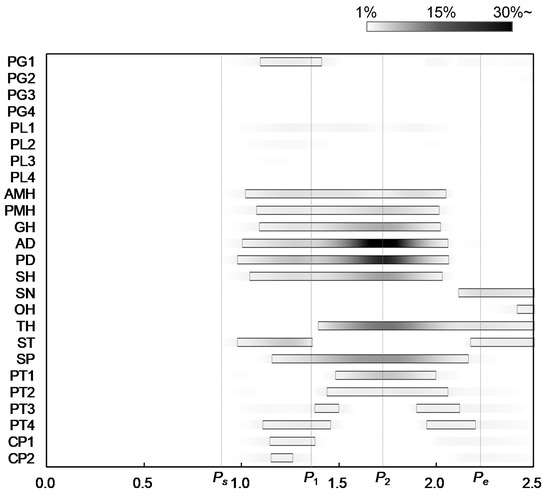 where and are the estimated force and the maximum force of muscle, calculated by Equations (3) and (9), respectively. The figure also shows the three characteristic points defined in Figure 2 to compare the muscle activities with the movements of the hyoid bone and thyroid cartilage. Figure 7 shows the onset and duration of the muscle activity, which was derived from Figure 6. The activation level was defined as values higher than 1% of the maximum force, and the contrast coloring changed depending on the muscle force. The results suggest which muscle mainly contributes to swallowing, and they confirmed that the activities of the muscles correlate with the movements of the hyoid bone and thyroid cartilage.