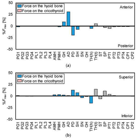 The hyoid bone and thyroid cartilage mainly move in anterior and superior directions, as shown in Figure 2. Therefore, to calculate the maximum contraction forces of the muscles in the anterior-posterior direction and the superior-inferior direction, it is important to investigate the role of each muscle in the movements of the hyoid bone and thyroid cartilage. Figure 8 shows the direction of the maximum contractile force of each muscle in the anterior-posterior and superior-inferior directions, which were calculated from Figure 6.