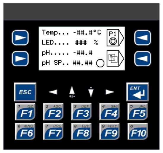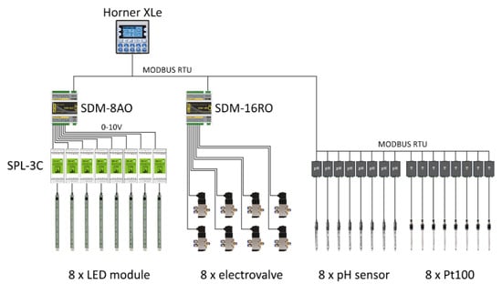 A PLC device, with an integrated control panel -series XLe (Horner APG, Indianapolis, United States) was used to control the station for the propagation of microalgae inoculum. This device has a 2.2-inch diagonal monochromatic screen, resolution: 128 × 64 pixels, 10 fully programmable function keys, and an alphanumeric keyboard. This allowed displaying basic information about the controlled process parameters and provided access to the parameter settings for all photobioreactors. The XLe driver has two serial communication ports RS232/485. One of the ports was used to maintain cooperation with the station’s measuring and control devices.