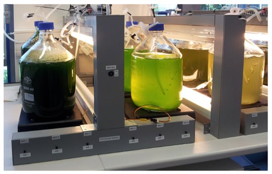 The system used scaling-up of cultivation by a factor of 10 per step with eight days allocated for each stage [13]. As a result, it was possible to prepare a suitable amount of inoculum to start experiments in all six main photobioreactors (volume of 90 dm3) within 24 days. One photobioreactor from the inoculation station was intended to be used to inoculate one 90 dm3 photobioreactor. Using eight photobioreactors, in the propagation station, in comparison to using six main photobioreactors, allowed for the experiments to proceed smoothly and to gain a safety buffer in case of an accident, e.g., contamination of cultivation, a necessity to repeat the experiments or anomalies in the propagation process.