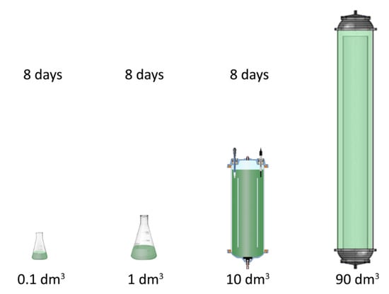 The utilized way of scaling the culture by a factor of 10 per step proved itself in practice. Admittedly, many researchers use higher factors (20–30) when scaling-up cultures [35,36,37]. However, in that way they are breaking the practical rule used, i.e., by fermentation technology, which says that each increase of scale should not surpass a factor of 10. Ignoring this rule results in, for example, the appearance of contamination and biological degradation, which translates into a decrease in the reliability, and stability of the production process [8].