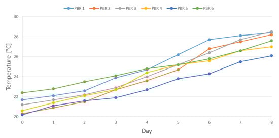 Changes in temperature over the course of the eight-day microalgae cultivation processes.