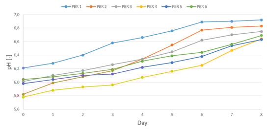 Similarly to the temperature measurements, a systematic increase in pH value was noted in the consecutive days of conducting cultivation. The pH increased from the level of 5.78 (–) in PBR 4 to the maximum level of 6.92 (–) in PBR 1.
