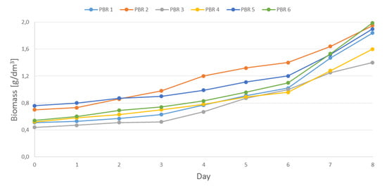 The initial biomass content after the inoculation of the photobioreactors was fluctuating between 0.47 g/dm3 in PBR 3 and 0.76 g/dm3 in PBR 5. The content of biomass after eight days ranged between 1.40 g/dm3 for PBR 3 and 1.99 g/dm3 for PBR 6.