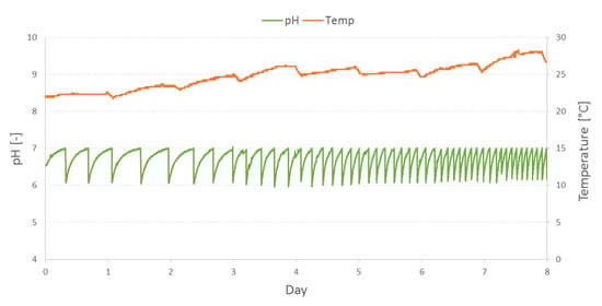 Figure 9 presents, aside from the upward tendency, the characteristic, recurring temperature fluctuations associated with the 24-h temperature cycle in the laboratory. Whereas the oscillations visible on the pH figure present the way of functioning of the on-off pH control algorithm when the set point is at the level of pH 7.0.