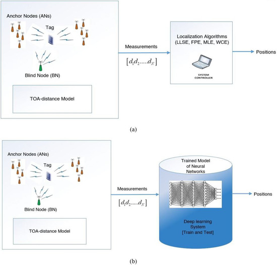 Ultra-wideband (UWB) localization systems. (a) Conventional UWB localization system. (b) Proposed UWB localization system using deep learning.