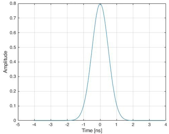 where A is the amplitude of the signal and is the standard deviation related to the pulse shape factor. The simulation uses the pulse width of 0.5 and Figure 3 shows the generated UWB pulse for transmission.