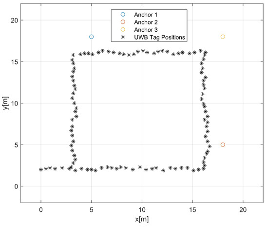 To evaluate the performance and position accuracy of our proposed LSTM model, we used the MATLAB R2019b (MathWorks, 1 Apple Hill Dr, Natick, MA 01760, United States, 2019) simulation environment with all built in tools. We simulated an experiment area with UWB anchors and a tag. Figure 9 indicates the UWB anchors and tag positions from a MATLAB simulation. In Figure 9, the starting position of the UWB tag is defined as (0, 2) and moved the UWB tag at a constant speed. We placed three anchors in the simulation environment based on the UWB tag motion. The positions of the anchors depend on the UWB tag motion and which covers the simulation environment. The UWB tag communicates with three anchors and estimates the tag distance from all anchors. The small circles in the Figure 9 show the anchor positions and the black star marks indicate the UWB tag motion. We moved the UWB tag in a random position based on a rectangular motion.