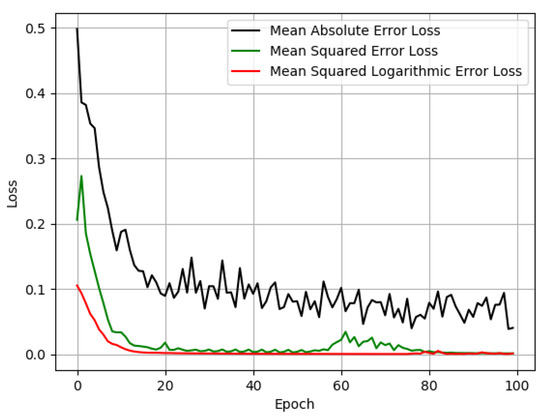 Next, we consider the effect of different loss functions for the LSTM model. The loss function used in the deep leaning model reduces the error in the prediction. For the regression loss function, networks use mean squared error loss (MSE), mean squared logarithmic error loss (MSLE) and mean absolute error loss (MAE). To find the best loss function, we analysed the effect of different loss functions and Figure 12 shows their performance.