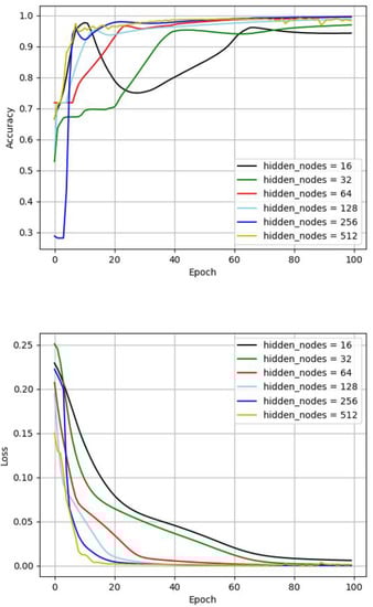 In Figure 14, the localization accuracy during the training in terms of epochs with varying hidden nodes from 16 to 512 with batch size of 5 is shown. If we use few hidden nodes, the result shows a high training error and high generalization error due to underfitting. On the other hand, for the high number of hidden nodes, the result shows low training error and high generalization error due to over fitting. Through our several simulation results, we obtained the number of hidden node as 256.