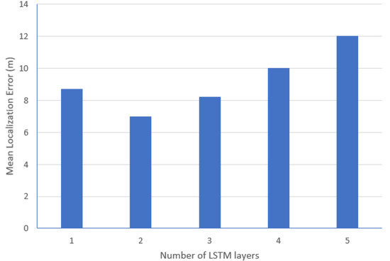 From Figure 16, the proposed two-layer LSTM approach shows better performance than standard LSTM (one LSTM layer) and a higher number of LSTM layers. The results show that if we increase the number of LSTM layers, the UWB system shows worst performances. This is due to the overfitting of the networks with more layers. The proper selection of the number of LSTM layers is an influencing factor of the localization performances and our system used the two-layer LSTM network for better performances.