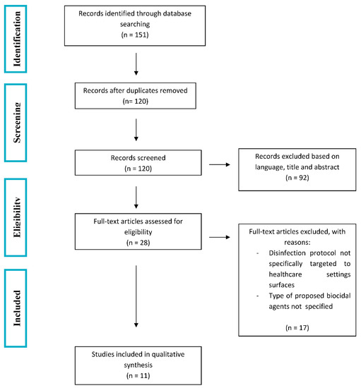 After the research on the four databases (PubMed, Science Direct, Scopus, and Cochrane Library), a total of 151 items were found. After duplication removal, 120 articles were submitted to title, abstract, and full text examination. Since this review included only English publications, 12 studies were not selected, because they were written in Chinese; fifty-five articles were excluded based on title; twenty-five based on abstract, and seventeen after a full-text evaluation. Data extraction was consequently performed for the 11 selected studies. Principal outcome measures reported in this review were: (1) type of biocidal agents used for surfaces/floor disinfection, (2) required contact time and frequency for the disinfectant to act, and (3) the area of the healthcare setting in which the disinfection protocol was implemented.