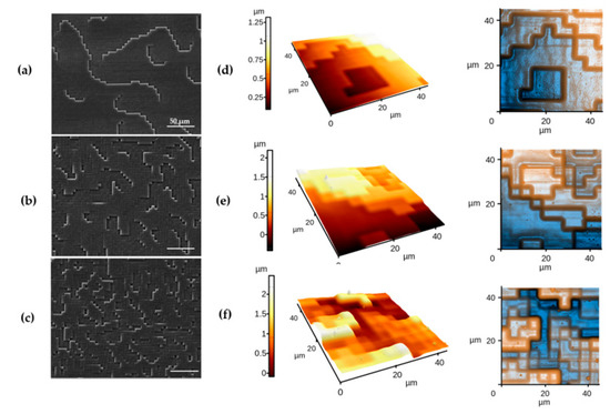 Scanning Electron Microscopy images of surface structures polydimethylsiloxane (PDMS) (a) Low-density square unit (LDSU), (b) Medium-density square unit (MDSU), and (c) High-density square unit (HDSU), with scale bar of 50 µm. Atomic Force Microscopy images of the PDMS structures of (d) LDSU, (e) MDSU, and (f) HDSU, respectively, with corresponding topographies in 3D and 2D representations combined with a synthetic illumination effect used to enhance the contour of each obtained slope.