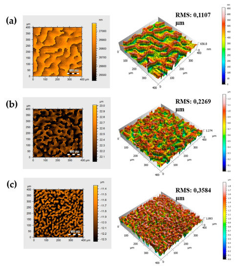 Profilometry analysis of the PDMS samples; top view results on the left-side and 3D maps on the right-side together with root mean square (RMS) values for: (a) LDSU; (b) MDSU and (c) HDSU, respectively.
