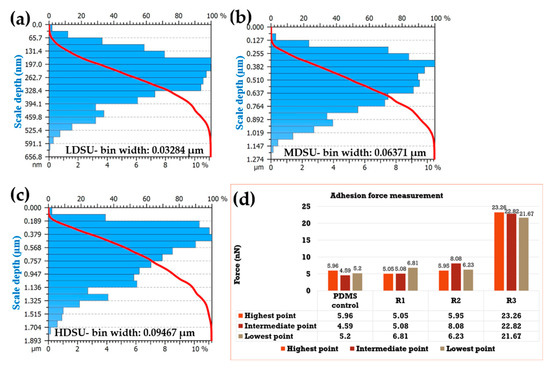 Distribution of PDMS depths: (a) LDSU; (b) MDSU and (c) HDSU. The obtained histograms show the depth values on the vertical left-side; each histogram contains a number of 20 bins, with the bin width of 0.03284 µm (a-PDMS–LDSU), 0.06371 µm (b-PDMS–MDSU) and 0.09467 µm (c-PDMS–HDSU), respectively. The bin widths were assigned automatically by the software (APEX 3D BASIC software analyses V7, Digital Surf, Besançon, France, 2016, approved by ISO 25178). (d) Histogram representation showing the adhesion force values of the different PDMS replicates.