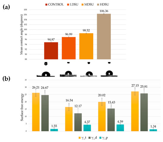 Lastly, contact angle measurements and surface free energy analysis were performed to evaluate the degree of contact surface wetting and the hydrophobicity of PDMS, respectively. As shown in Figure 4a, even though the PDMS contact angles changed with the various types of structure densities, all surfaces remained hydrophobic. Analysis also showed that increasing the density of the primary units on the individual PDMS replicas induced an increase in the contact angle value. Our results are in good agreement with the data obtained using the sessile drop technique and reported in literature—i.e., 95.2 ± 0.9 [38]. Surface free energy, as determined by the OWRK method, showed that the energy profiles mimic the hydrophobicity ones. Analysis also showed that, as the polar component increased, the density of the structural units increased, with the exception of HDSU interface that maintained this component close to that of the PDMS used as a control (1.34 mN∙m-1) [42,43]. An increase in the polar component of surface energy (1.55 to 4.59 mN∙m-1) was observed and correlated to the increase in density of structural units for LDSU and MDSU, respectively.