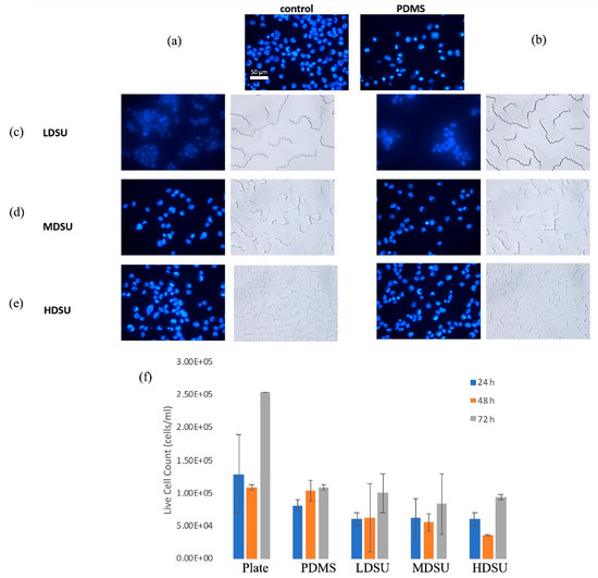 The individual or conglomerate profiles were presumably determined by the overall topography and the amount of interactions between individual cells and respective surfaces. Specifically, close interactions between cells and substrates are known to be essential for improved cellular responses, especially when considering the development of tissue constructs, enhanced cytoskeletal organization, cell growth and cell proliferation, respectively [46]. When comparing the cell numbers for the different surface morphologies (Figure 5f), analysis showed that there was generally a relatively homogenous response of the exposed cells. Specifically, the number of the cells grown on different surfaces showed no significant differences after 24, 48 or 72 h, respectively, all relative to controls. After 24 h, cell activity, however, seemed to decrease on PDMS, regardless of the presence or absence of topographic features; however, at 72 h, the HDSU replica appeared to favor cell proliferation, as shown in Figure 5f and supported by the lower variation in the cell numbers as reported relative to MDSU and LDSU surfaces, respectively [47,48].