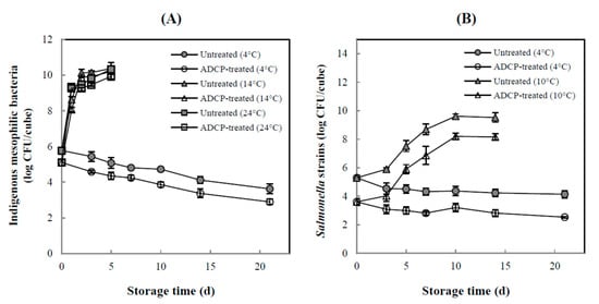 Salmonella inoculated into CBCs were reduced by 1.45 ± 0.05 log CFU/cube, from 5.04 ± 0.13 log CFU/cube to 3.59 ± 0.06 log CFU/cube, due to ADCP treatment (Figure 1B). The microbial level of ADCP-treated CBCs stored at 4 °C for 21 d were reduced by 1.4–1.7 log CFU/cube (which was maintained), compared to untreated CBCs. However, as a similar result was also observed for indigenous mesophilic bacteria, the sublethal injury could not be ascertained. Storage at 10 °C for 14 d resulted in microbial levels being reduced by 1.3–1.7 log CFU/cube, where a steady increase in which reduction was maintained, and similarly, the sublethal injury could not be ascertained.