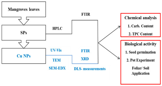 For the extraction of sulfated polysaccharides, ethanol (96%) was purchased from the International Company for Supplies and Medical Industries (Giza, Egypt). For chemical analyses, phenol (BDH, England), sulfuric acid 98% (Penta, Prague, Czech Republic) and Folin and Ciocalteu’s phenol reagent (Loba Chemie, Colaba, Mumbai, India) were used. For nanoparticle synthesis, copper sulfate pentahydrate (CuSO4·5H2O) was purchased from Anachemia Ltd. (Montreal, QC, Canada). For pot experiment, NPK fertilizer which constitutes (20/20/20) by weight (on dry basis) of nitrogen/phosphorus/potassium elements, was purchased from Misr El-Dawliya for Agricultural and Industrial Development Co. (Kwesna, Egypt) and dimethyl sulfoxide (DMSO) was purchased from Daejung Chemical and Metal Co., Ltd. (Siheung, Korea).
