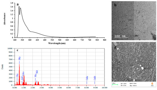 To confirm the formation of Cu NPs, UV-Vis spectroscopy and TEM imaging were used. Figure 2a demonstrates the UV-visible spectrum of Cu NPs where an absorbance peak appears at the range of 250–350 nm. A similar range was reported in the previous literature for Cu NPs biosynthesized using gooseberry fruits [30] and Vitis vinifera leaves [31]. In Figure 2b, the TEM micrographs show regular spheres with an average diameter of approximately 2.11 ± 0.64 nm. Larger sized copper oxide nanoparticles of dimensions 5–45 nm have been synthesized from brown alga (Bifurcaria bifurcata) as reported in the previous literature [13]. In addition, the SEM images in Figure 2d reveal homogenous and spherical particles, with an elemental composition of 54.97% O, 19.20% C, 13.64% S and 12.18% Cu by mass as analyzed by EDX (Figure 2c). DLS measurements showed that the produced Cu NPs are slightly negative in charge with a zeta potential of 11 ± 0.46 mV at the working pH range of 6–7. This charge aids to reduce the agglomeration between the Cu NPs and it could be attributed to the SPs functional groups present in the coating layer.