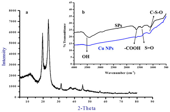 XRD pattern (a) of Cu NPs and FTIR spectra (b) of SPs and Cu NPs.