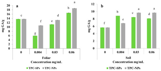 Although a decrease in the total chlorophyll and carotenoids was previously observed after 14 days of application of SPs, yet it can be inferred that the plant overcame this effect after 28 days by producing antioxidants as a defense mechanism. Plants can survive under the oxidative stress of biotic or abiotic SPs by exhibiting adaptive biochemical responses that entail the production of antioxidant compounds or enzymes. Antioxidative defense systems can be nonenzymatic involving, for example, an increase in the total phenolic content, or enzymatic employing peroxidase (POD) and catalase (CAT) enzymes. These defense mechanisms protect plants against oxidative stress damage and enhance its growth [50,57]. This hypothesis can be confirmed by inspecting Figure 4a,b which depict the total phenolic content (TPC) of wheat leaves upon exposure to SPs and Cu NPs in foliar and soil applications, respectively. As can be observed in (Figure 4a,b), the TPC significantly increased relative to the control upon increasing the concentration of SPs to 0.06 mg/L, thus recording 16.59 and 8.13 mg GA/g in foliar and soil applications, respectively. A positive correlation between antioxidant activity and TPC has been previously reported [21].