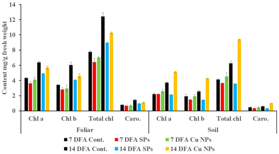 Contents of chlorophyll and carotenoids (mg/g fresh weight) of wheat seedlings treated by 0.06 mg/L of SPs and Cu NPs after 7 and 14 days from foliar and soil applications. The black bar indicates the control for each measured parameter.