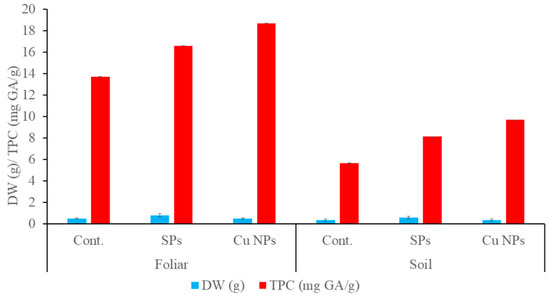 The effects of 0.06 mg/L of SPs and Cu NPs on the TPC and the dry weight after 28 days of foliar and soil applications are depicted in Figure 6. Clearly, the treatment with either SPs or Cu NPs enhanced TPC in both applications. On the other hand, the dry weight increased with SPs treatment and was maintained relative to the control in the case of Cu NPs treatment. This is probably due to the antioxidant defense mechanism undergone by the plant as explained earlier.