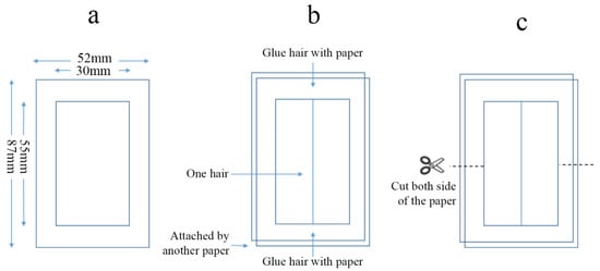 (a) Prepared square-hole paper (87 × 52 mm with 55 × 30 mm hole); (b) one hair glued in the middle of the paper before being attached to another paper; (c) cut both sides of the paper after mounting it on the Tensile Testing Grip (A/TG).