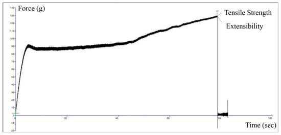 “Texture Exponent” program showing a graph of test result involving Tensile strength force (g) and time(s).