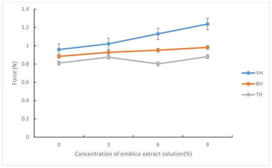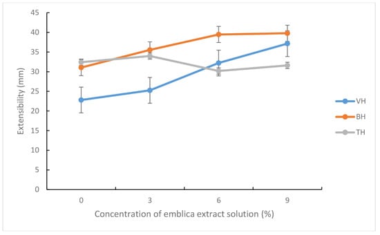 The extensibility of VH and BH were statistically significantly increased by all concentrations of EXS except for the increase in the extensibility of BH caused by an increase from 6% EXS to 9% EXS, which was statistically insignificant; this means that 6% EXS was the minimum concentration that could cause the maximum extensibility for BH (0.40 ± 0.05%).
