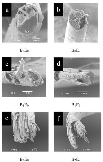 From the illustrations of BH (Figure 6e–h), 9% EXS could coat BH surface as smooth as VH, but the cuticle was more damaged and fractured.